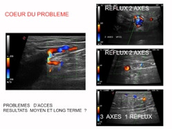 Une des limitations est celle de l’accès et de l’éradication des ramifications qui peuvent accompagner le tronc principal  ( voir image échographique çi dessous )  au cours du même geste , ce qui n’est pas le cas de la chirurgie . Ses branches portent le risque de « rechute » à moyen et long terme , et peuvent susciter des traitements complémentaires  ( phlébectomies - Mousse sclérosante - Redo …  ) . L’autre étant le lieu et mode de jonction avec le système veineux profond .
